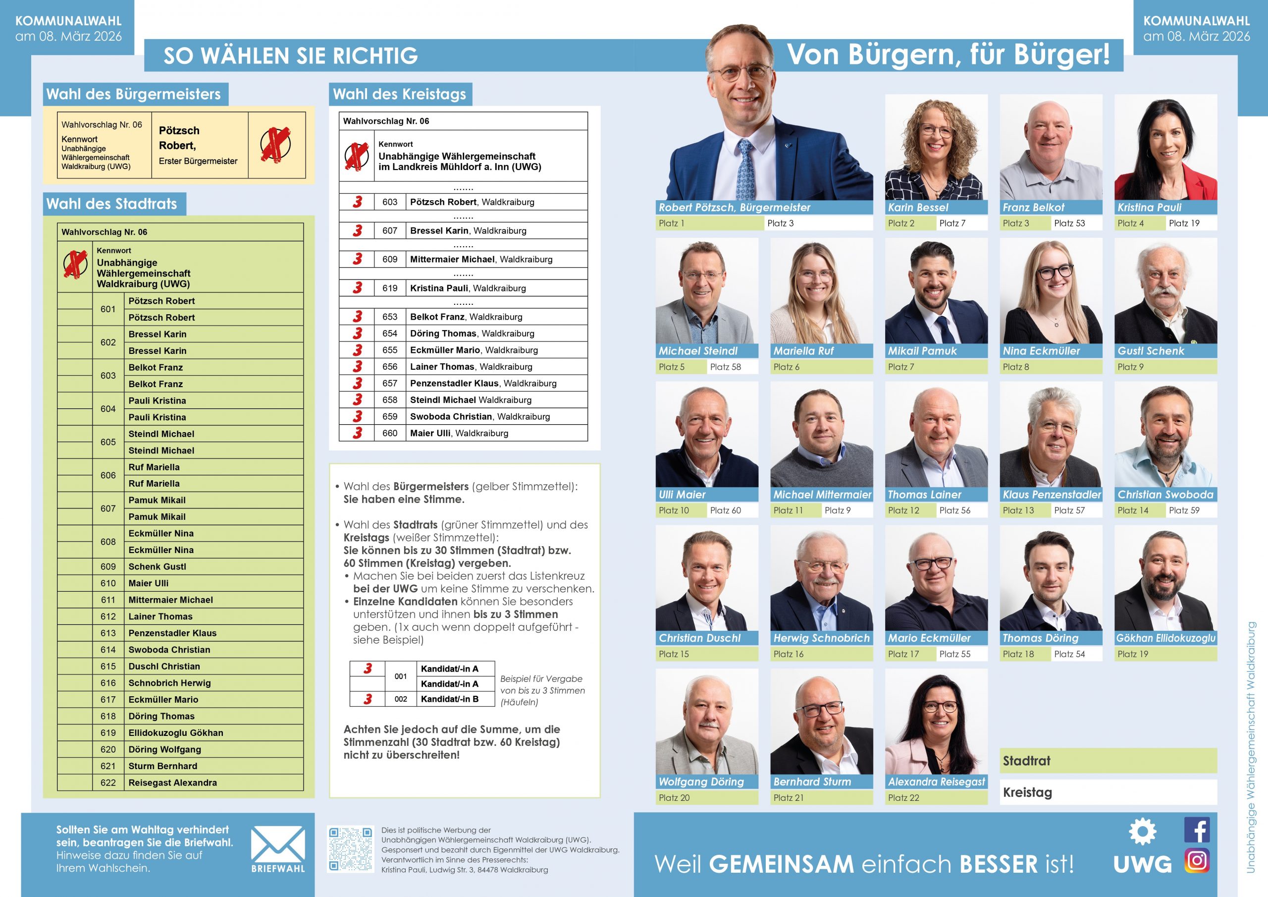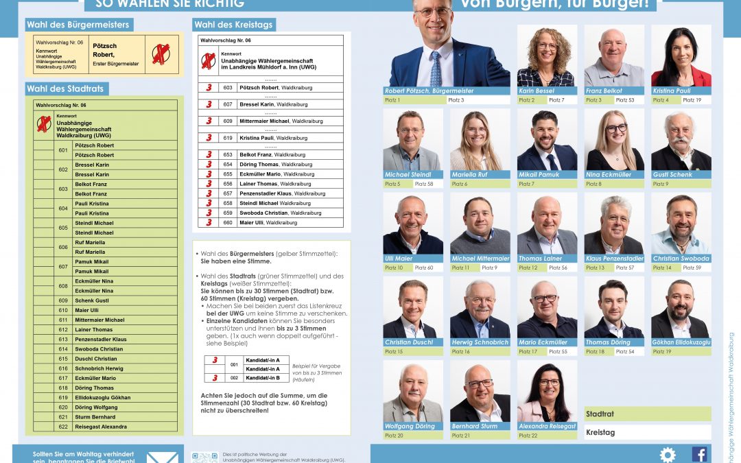 Am 08.03. steht die Wahl an. Wir freuen uns über jede Stimme und hoffen, dass viele Waldkraiburgerinnen und Waldkraiburger von ihrem Wahlrecht Gebrauch machen und uns erneut ihr Vertrauen schenken. Gemeinsam können wir unsere Stadt weiter voranbringen.